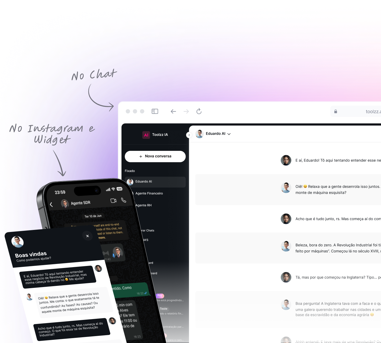 O Toolzz AI é uma plataforma de agentes de inteligência artificial personalizados para empresas. Crie assistentes virtuais inteligentes treinados com o conhecimento do seu negócio — documentos, FAQs, catálogos, processos internos. Os agentes atendem clientes no WhatsApp, Instagram e site com respostas precisas e contextuais, 24/7. A tecnologia multi-agentes (AI Workforce) permite montar equipes completas de IA, uma para cada departamento: vendas, suporte, RH, financeiro. Mais de 1.500 empresas confiam no Toolzz AI.