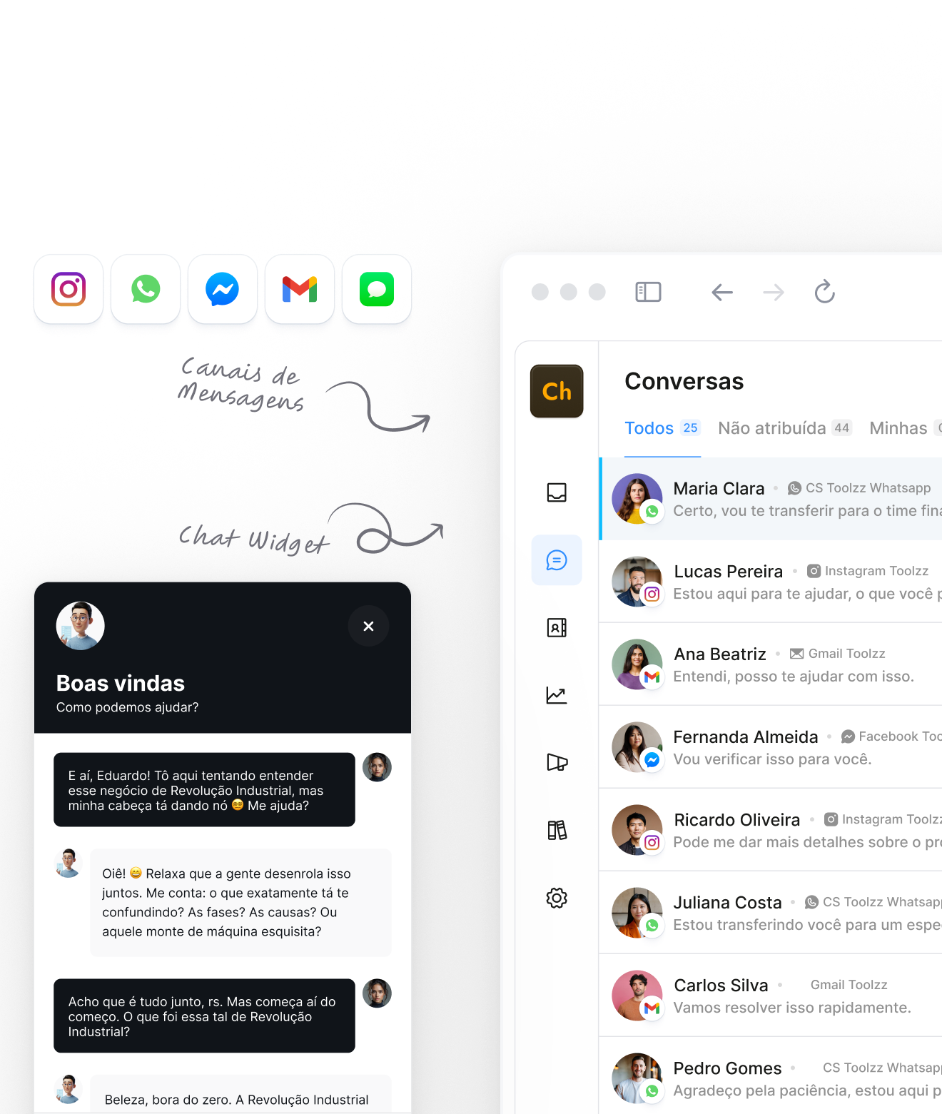 Gerenciar canais de comunicação pode ser caótico. Centralize WhatsApp, Instagram, e-mail e chat em uma plataforma para simplificar o atendimento e garantir respostas rápidas e precisas. Otimize seu atendimento e aumente a satisfação.